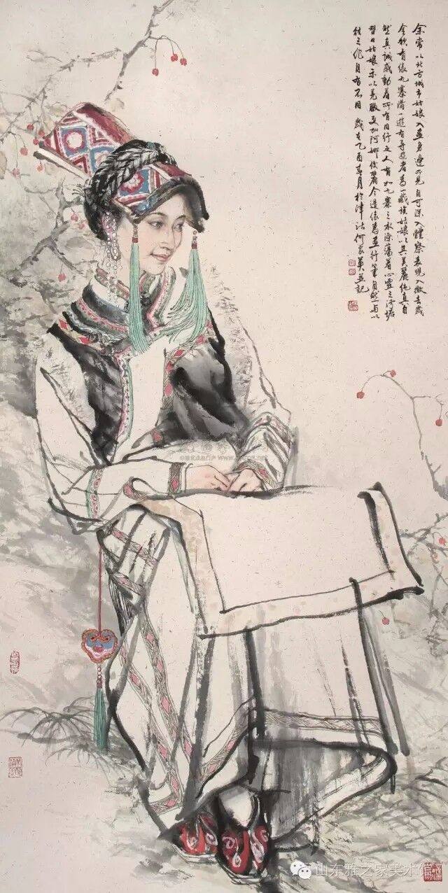 这幅作品倾入何家英先生很多艺术情感,表现出了与以往作品不同的创作形式。正如其在题识中写道:“余常以北方城市姑娘入画,身边所见自可深入体察、表现入微。去岁金秋有缘九寨沟一游,有导游者为一藏族姑娘,以其美丽纯真、自然真诚感动着所有同行之人,有如九寨沟之水涤荡着心灵之污垢。翌日,姑娘示以羌服更加婀娜俊丽,今造像为画行笔自然与以往之作自有不同。”
